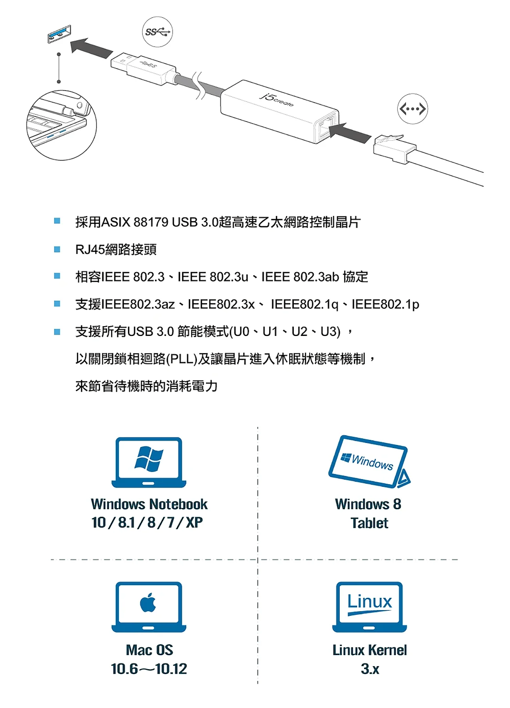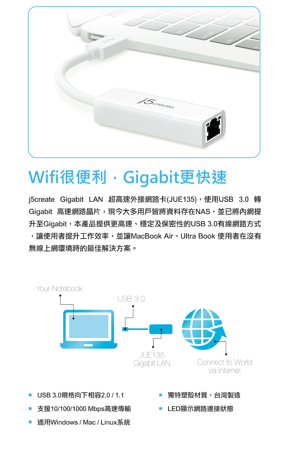 JUE135使用USB 3.0 轉 Gigabit 高速網路晶片,現今大多用戶皆將資料存在NAS,並已將內網提升至Gigabit,本產品提供更高速、穩定及保密性的USB 3.0有線網路方式,讓使用者提升工作效率,並讓MacBook Air、Ultra Book 使用者在沒有無線上網環境時的最佳解決方案。